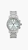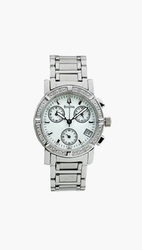 - Stainless-steel case; pearlized-white dial; date function; chronograph functions